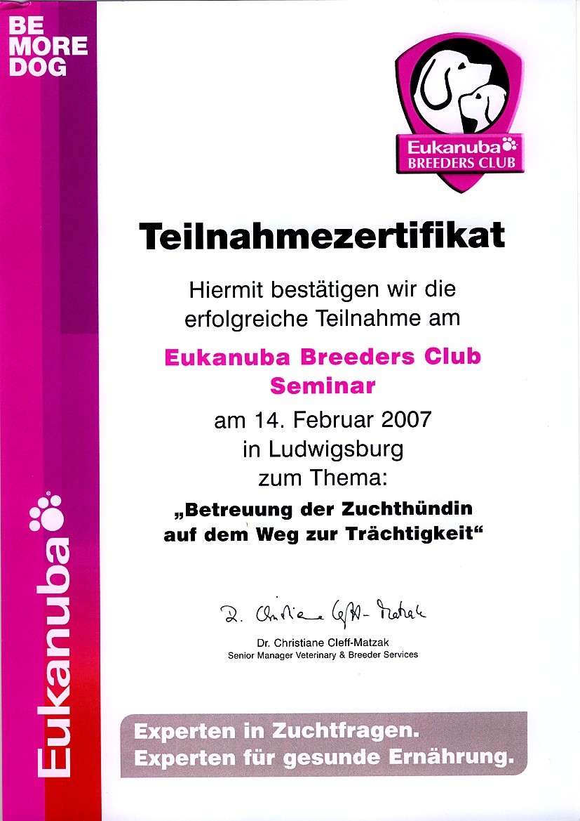 Ich war Züchterin im VDH und habe an Fortbildungen und Seminaren zur Zucht, über Hundeverhalten, Hundesozialisierung und Ausbildung teilgenommen.