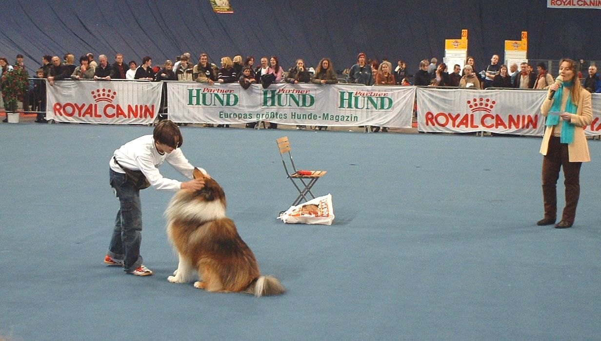 Demonstration auf einer Hundeschau. Der Therapiehund wird im Kopfbereich stark bedrängt. Er muss dies ohne Probleme aus-